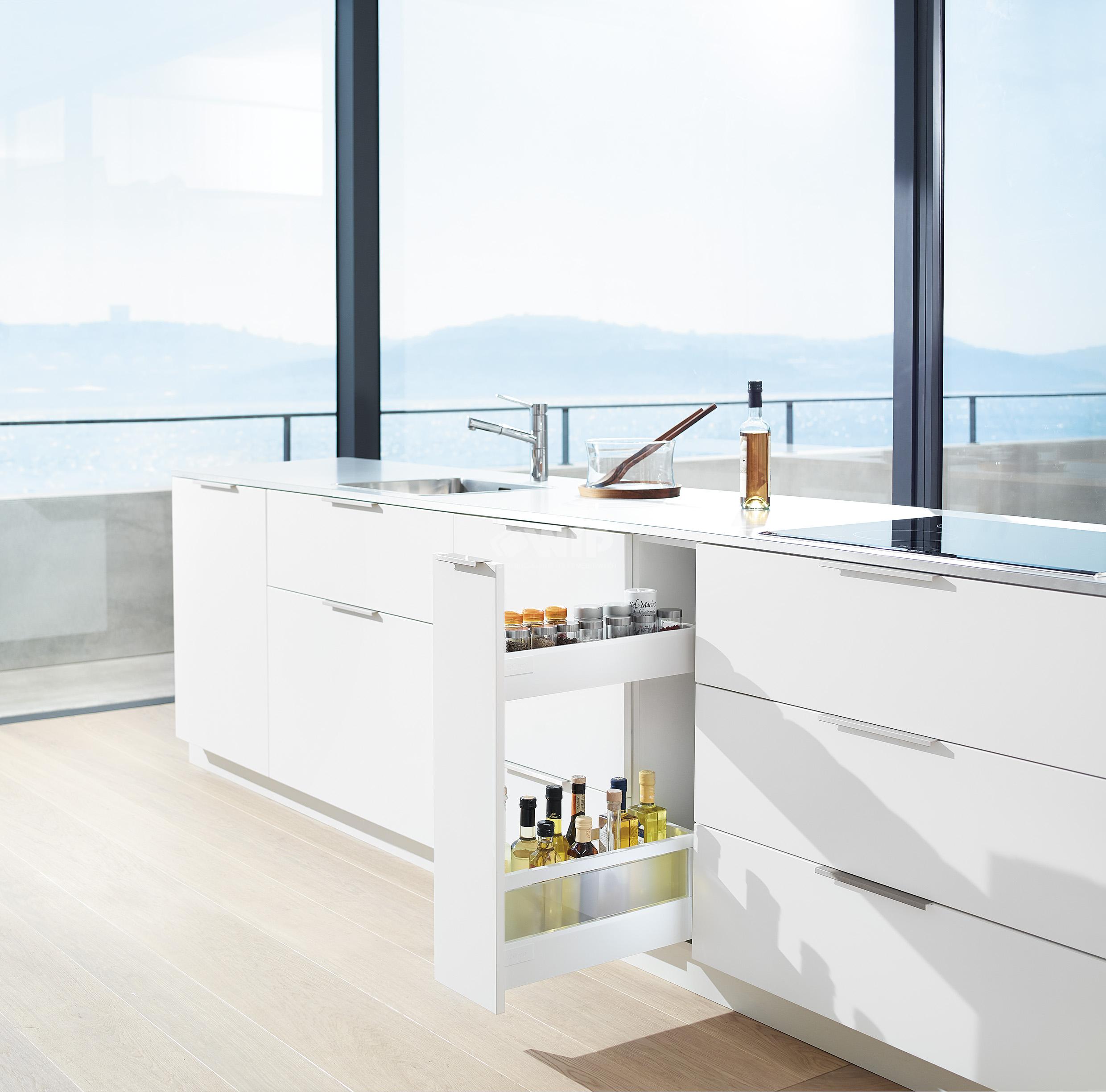 Mini cargo Blum, bazujące na prowadnicach rozmieszczonych po przekątnej, tworzy dodatkową przestrzeń użytkową – bez konieczności rezygnacji ze stabilności i z jakości ruchu. Mini cargo Blum z systemem szuflad TANDEMBOX antaro zapewnia także jednolity wygląd zastosowanych okuć. Poza tym prowadnice oferują możliwość dużego obciążenia szafki aż do 20 kg.
