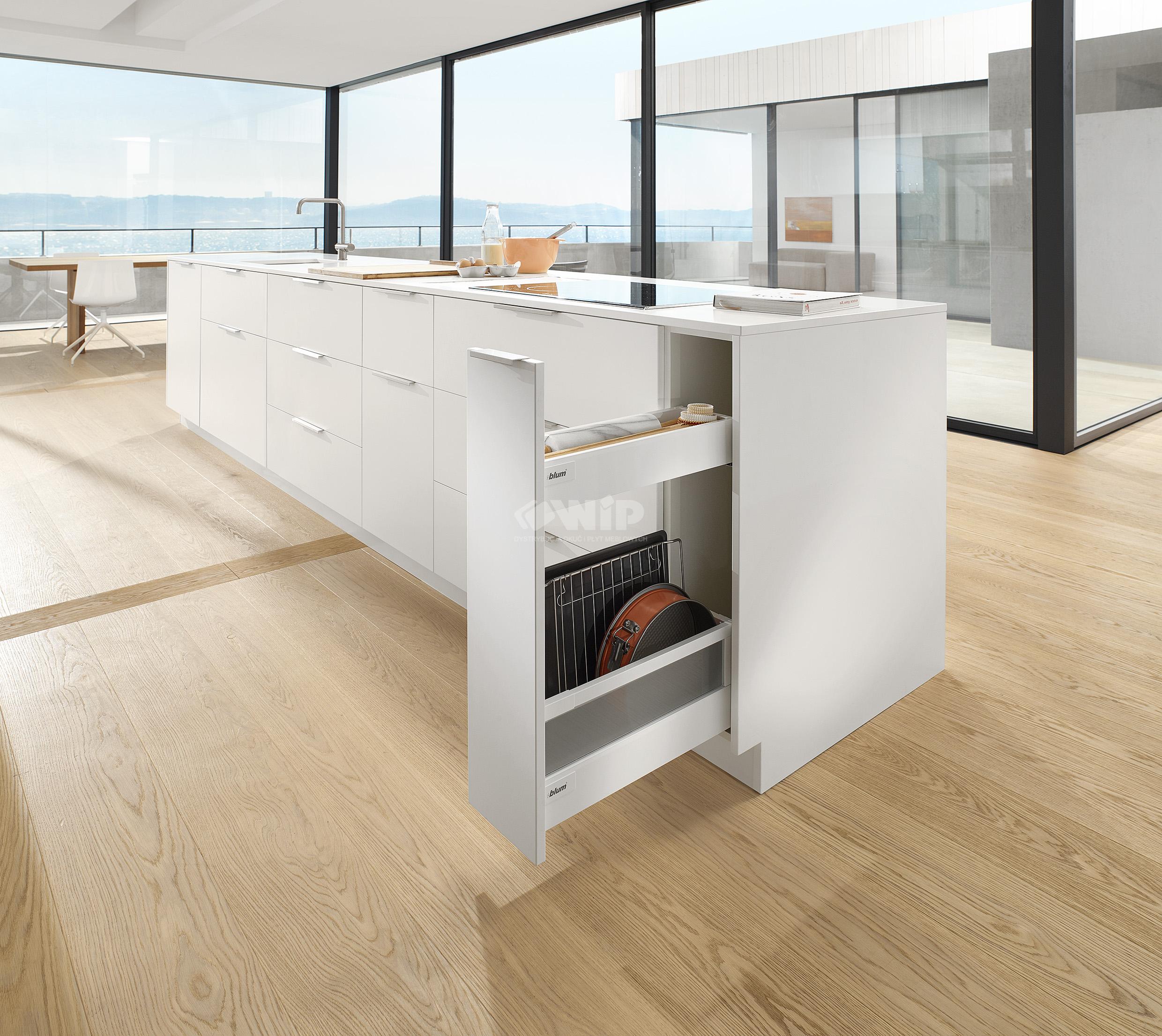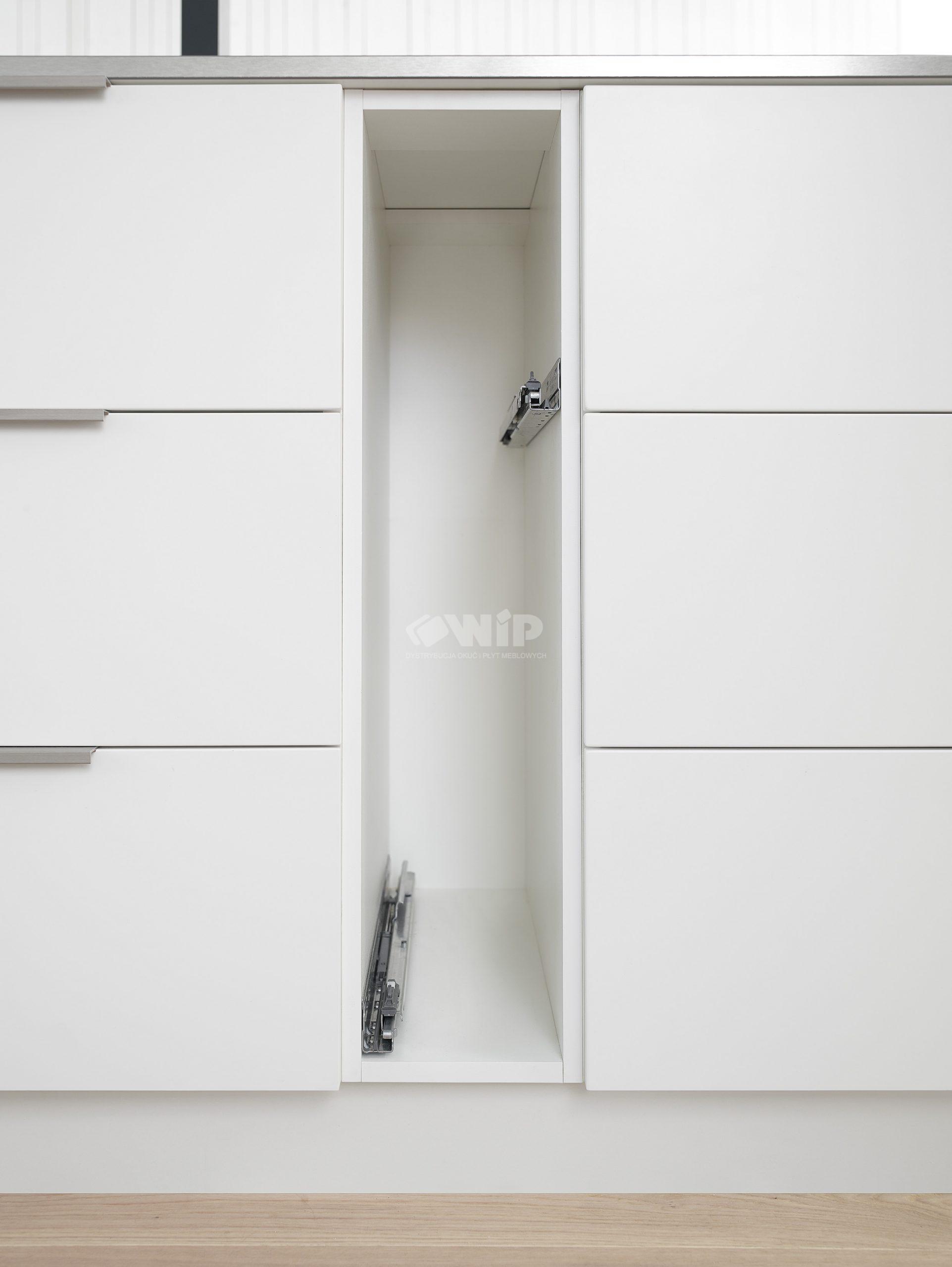 Dzięki różnorodności i wielu możliwości zastosowań systemów Tandembox Antaro firmy BLUM, możemy dowolnie komponować przestrzeń w kuchni, jednym z takich rozwiązań jest mini cargo do wąskich szafek o szerokości 200mm.