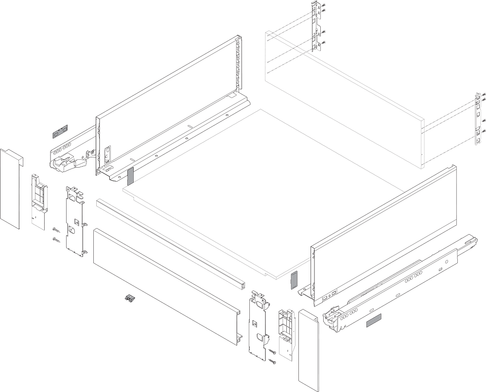 Montaż boków szuflady ze ścianką tylną: przez zatrzaśnięcie (stalowa ścianka tylna lub uchwyt drewnianej ścianki tylnej)