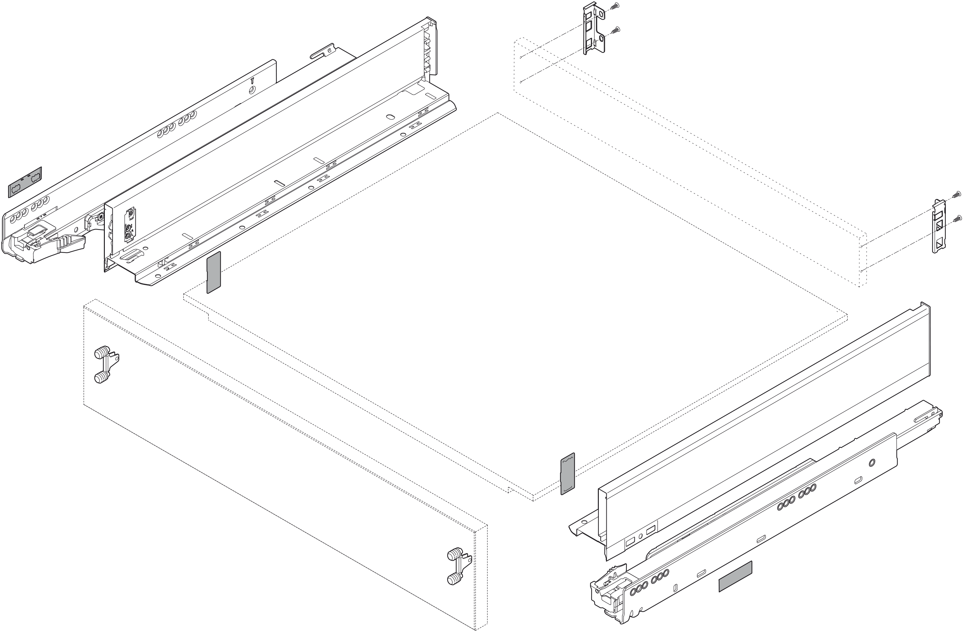 Montaż boków szuflady ze ścianką tylną: przez zatrzaśnięcie (stalowa ścianka tylna lub uchwyt drewnianej ścianki tylnej)