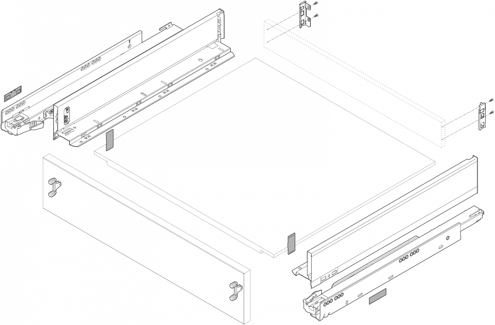 Montaż boków szuflady ze ścianką tylną: przez zatrzaśnięcie (stalowa ścianka tylna lub uchwyt drewnianej ścianki tylnej)