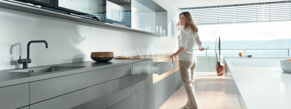 TIP-ON BLUMOTION łączy zalety mechanicznego wspomagania otwierania TIP-ON ze sprawdzonym systemem hamowania BLUMOTION. Delikatne naciśnięcie otwiera szufladę. Energiczne pchnięcie aktywuje funkcję TIP-ON, następnie BLUMOTION dba o ciche i delikatne zamknięcie. Co niezwykłe – ruch jest wspomagany wyłącznie mechanicznie.