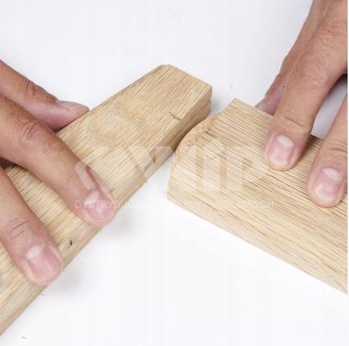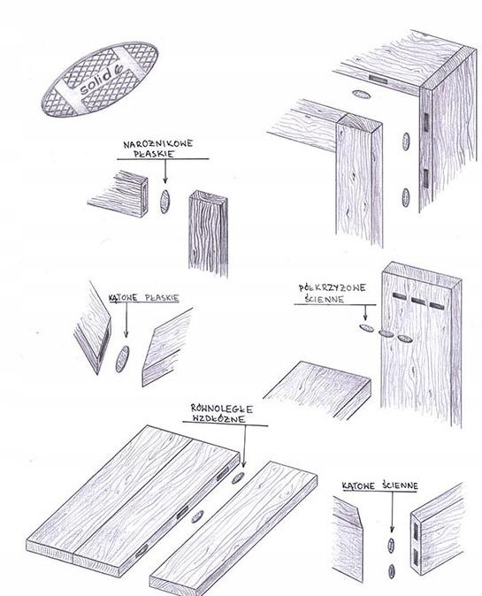 W celu połącznia elementów lamelkami, najpierw za pomocą frezarki (lamelownicy) trzeba w łączonych elementach wykonać otwory w zaznaczonych miejscach. Następnie ręcznie lub przy użyciu aplikatora nanieść klej. Obce pióro ma zaokrąglone krawędzie, dzięki czemu bez problemu można je umieścić w wyfrezowanych „gniazdach” wypełnionych klejem. Nasze lamelki mają specjalne wytłoczenia na powierzchni, które pomogą ustabilizować rozprowadzenie kleju. Suche i sprasowane łączniki meblowe w wyniku kontaktu z wodą, znajdującą się w kleju, pęcznieją, szybko i trwale łącząc poszczególne elementy. Nadmiar kleju można łatwo łatwo upuścić za pomocą wilgotnej szmatki. Połączenie na obce pióro, jak i pozostałe połączenia klejone, wpływ na estetykę wykonania mebli – łączniki są niewidocznie w przeciwieństwie do połączeń mimośrodowych i na konfirmaty.