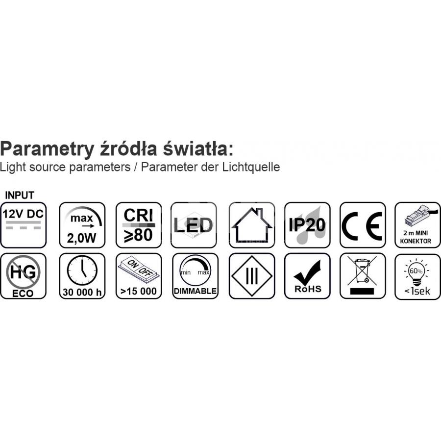 Zawiera 24 wbudowane diody LED o łącznej mocy 2W. Gwarantują one długą żywotność i niskie koszty eksploatacji. Oprawa posiada przewód o długości 2 m z MINI-KONEKTOREM ułatwiającym podłączenie oświetlenia do zasilacza LED.