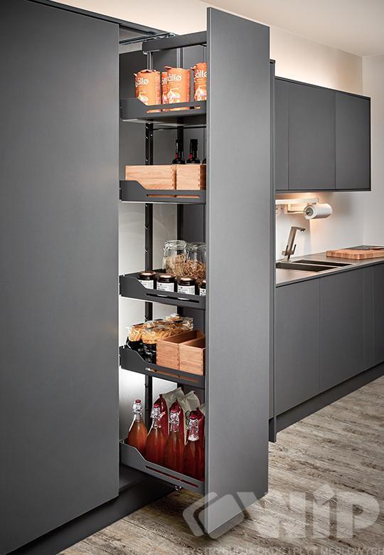 Wyciąg Dispensa dedykowany jest do szafki typu cargo, w którym ramę systemu mocujemy od wewnętrznej strony do frontu, natomiast prowadnicę dolną i górne prowadzenie do korpusu szafki. Po wysunięciu systemu z szafki mamy doskonały dostęp do przestrzeni magazynowej zarówno z jednej jaki i z drugiej strony.