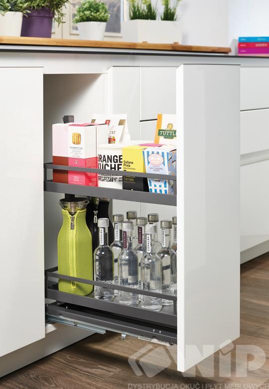 W skład zestawu wchodzą dwa kosze wykończone malowanym, antracytowym płaskim relingiem, a drewniane dno koszy pokryte jest antypoślizgową przezroczystą powłoką. Prowadnice montowane są do dna szafki, co zapewnia stabilność i wytrzymałość konstrukcji, dodatkowo za pomocą dwóch mocowań, rama mocowana jest do frontu szafki. Dzięki umieszczonym na ramie systemu haczykom, istnieje możliwość regulacji wysokości górnego kosza. Wyciąg wyposażony jest w system cichego domykania.