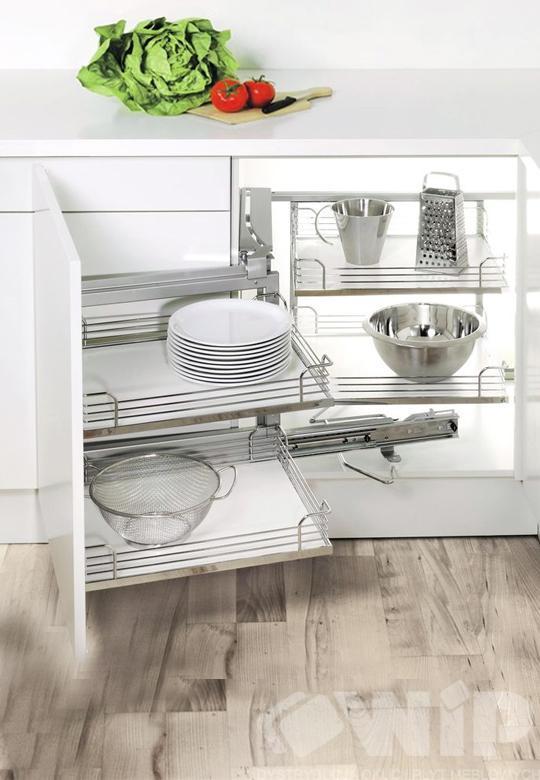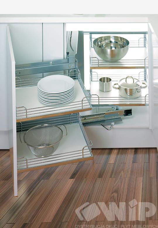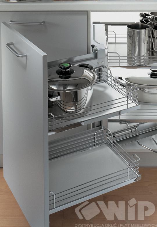 Otwieranie szafki i wysuwanie koszy odbywa się za pomocą jednego płynnego ruchu. W tym systemie front przymocowany jest do ramy i wyjeżdża wraz z przednimi koszami w trakcie otwierania szafki. W tym samym czasie tylne kosze przesuwają się w bok, co ułatwia korzystanie z tylnej, trudno dostępnej części szafki narożnikowej. Komplet posiada dwa kosze zewnętrzne o wymiarach 340 x 470 mm oraz dwa kosze wewnętrzne o wymiarach 390 x 470 mm.
