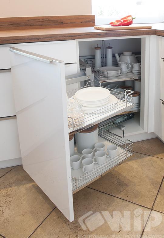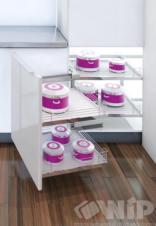 Magic-Corner Standard przeznaczony jest do szafek narożnych prostych, w których front mocowany jest do ramy systemu. Komplet do szerokości frontu min. 496 mm oraz wewnętrznej szerokości szafki 930-971 mm z koszami w linii ARENA Classic.