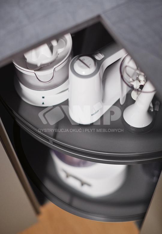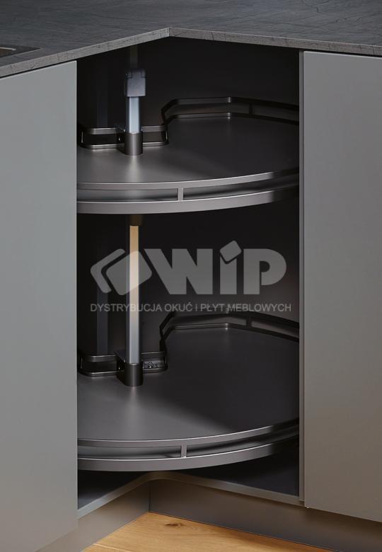 Oferujemy system REVO do dolnej narożnikowej szafki kuchennej (3/4). W tym systemie fronty są połączone na stałe z mechanizmem i obracają się wraz z półkami wewnątrz szafki. Po otwarciu któregokolwiek z frontu, uruchamia się mechanizm synchronizacji który „zaciska” oboje drzwi wewnątrz co umożliwi obrót półek, jednocześnie zapewniając nieograniczony dostęp do przestrzeni magazynowej. Po pełnym obrocie fronty automatycznie wracają do swojej pierwotnej pozycji, są delikatnie wytłumione i cicho zamykane. W razie potrzeby system posiada beznarzędziową regulację frontów 3D.
