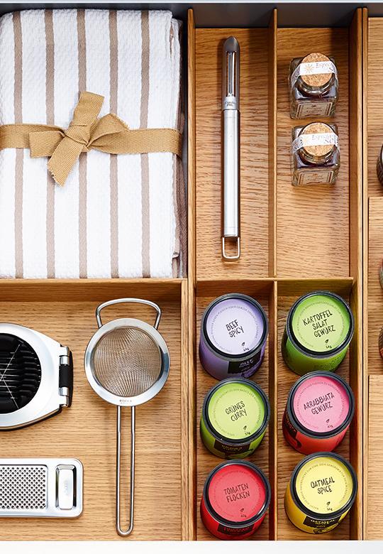 Wkład mieści się w każdej szufladzie i w którym można przechowywać 4-częściowy komplet sztućców. Zestawiony z innymi elementami z tej samej linii tworzy unikatowy wystrój szuflady.