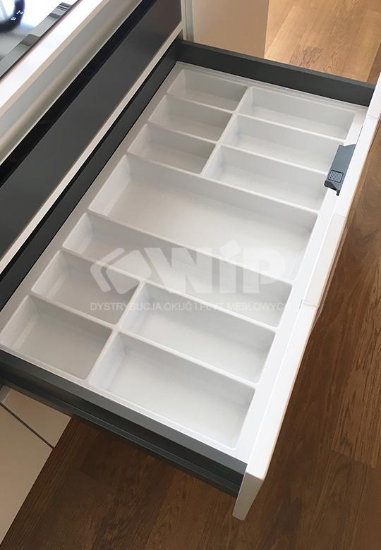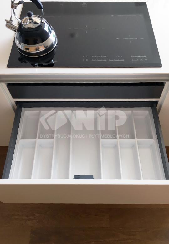 Wkład Classico na sztućce i akcesoria kuchenne w kolorze białym. Wkład pasuje do szuflad o szerokości frontu 800 mm i głębokości prowadnicy 500 mm. Wkład ma po szerokości i po długości szerszy zapas, który umożliwia samodzielne docięcie wkładu do niestandardowych wymiarów szafki z szufladami.
