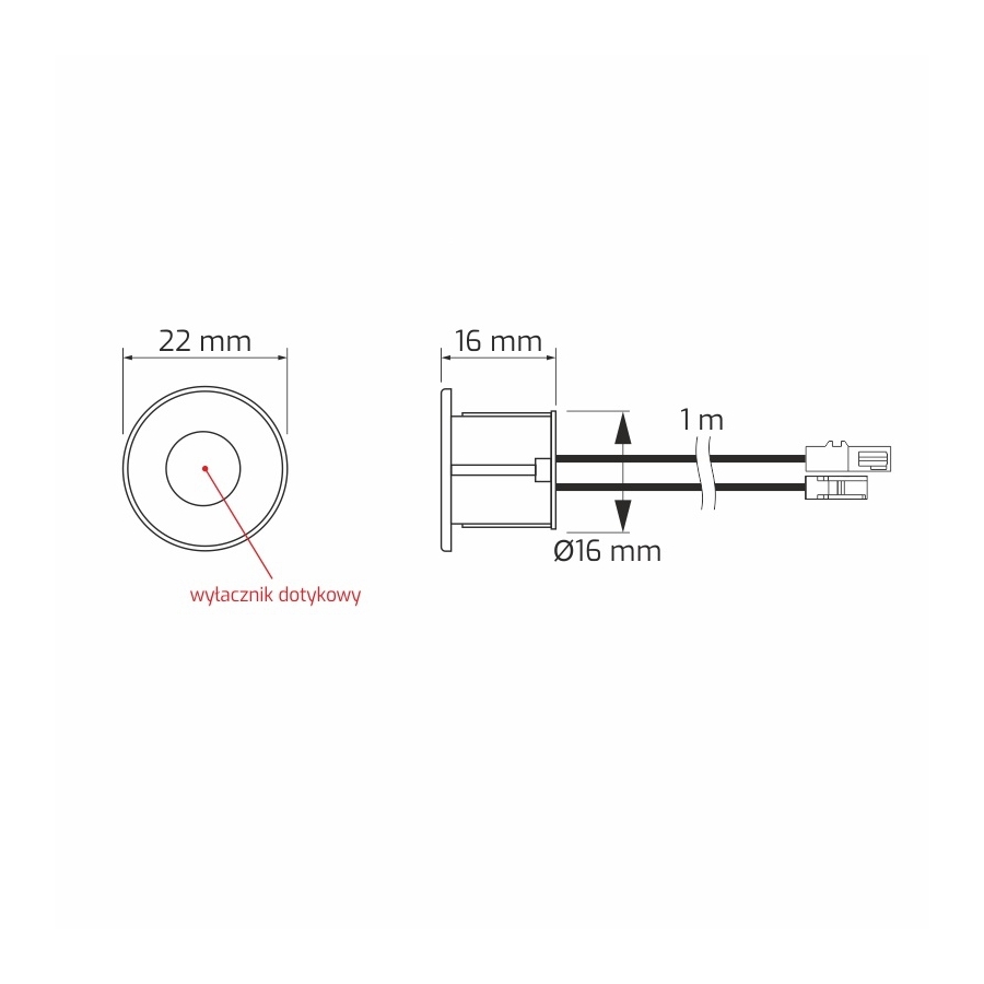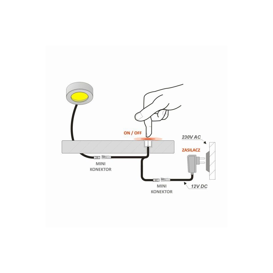 Zasilany napięciem stałym wyłącznik zamknięty jest w obudowie izolacyjnej z tworzywa sztucznego w kolorze chrom. Służy do włączania i wyłączania oraz ściemniania i rozjaśniania źródła światła LED przy użyciu zasilacza. Wyłącznik sensorowy (dotykowy) działa poprzez dotknięcie sensora, który powoduje włączenie lub wyłączenie oświetlenia.