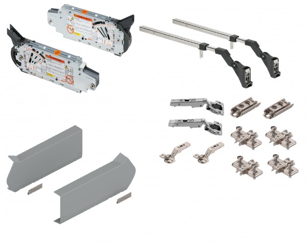 Kompletny zestaw AVENTOS HF do frontów uchylno-składanych to system do wysokich i średnich szafek górnych. Do korpusów o wysokości od 480 do 1040 mm i szerokość do 1800 mm.