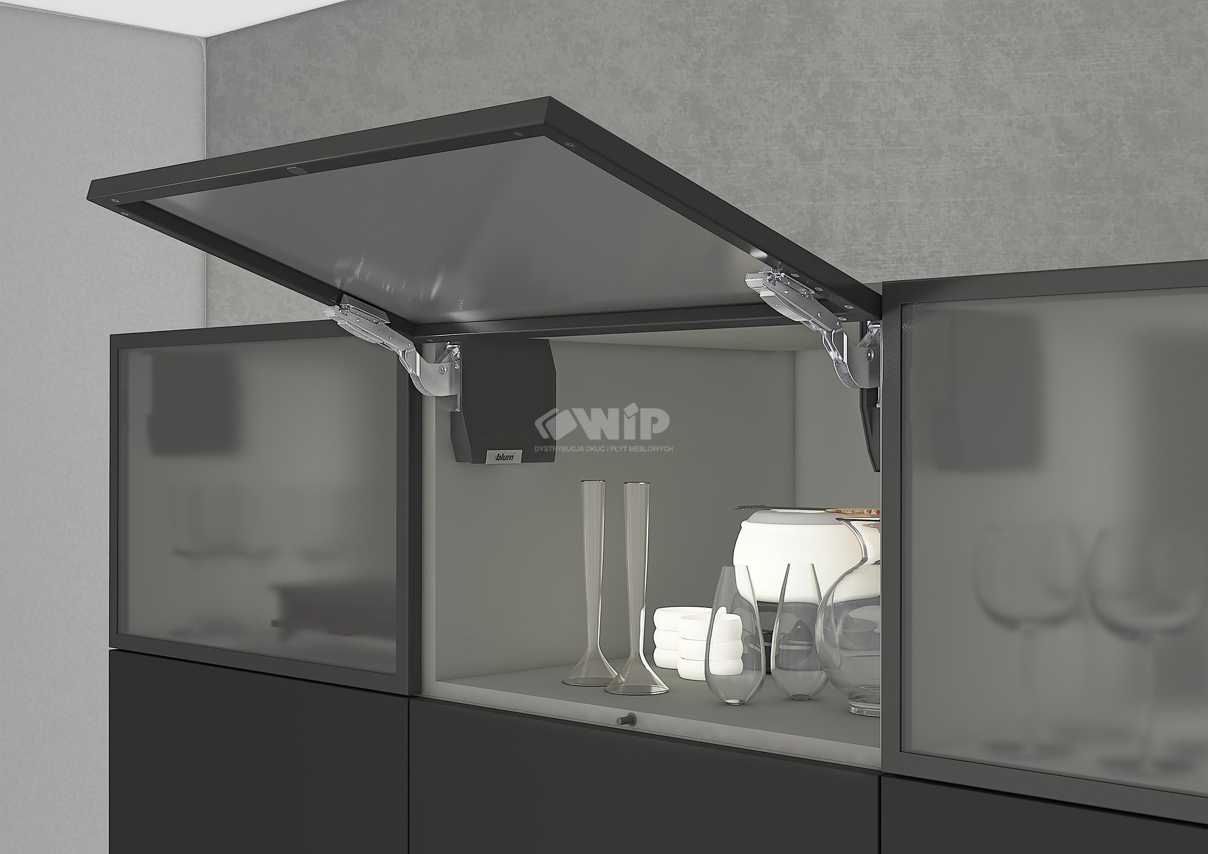 Kompletny zestaw AVENTOS HK-S Tip-On do frontów uchylnych to system przeznaczony do małych frontów górnych. Do korpusów o wysokości od 960 do 2215 i szerokość do 600 mm.
