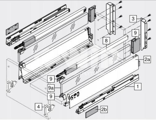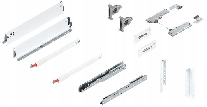 Kompletny zestaw wysokiej szuflady D z relingiem od Blum.