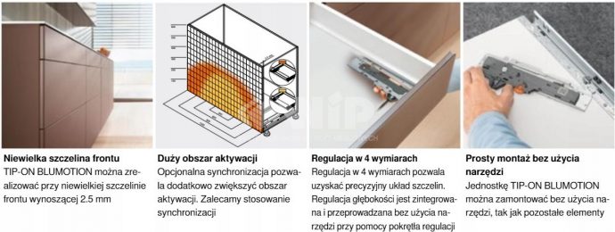 Duży obszar aktywacji na powierzchni frontu sprawia, że Tip-On Blumotion zapewnia zachwycający komfort obsługi szuflad bez uchwytów. Opcjonalna synchronizacja pozwala dodatkowo zwiększyć obszar aktywacji.