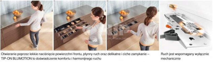 Tip-On BLUMOTION do Tandembox łączy zalety mechanicznego wspomagania otwierania Tip-On ze sprawdzonym systemem hamowania Blumotion, który dba o delikatne i ciche zamykanie – całkowicie mechanicznie.